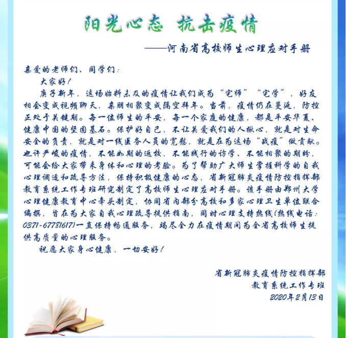 该手册由省委高校工委、省教育厅指导,依托郑州大学心理健康教育中心牵头制定,协同省内部分高校和多家心理卫生单位联合编撰,旨在为大家自我心理疏导提供指南和参考,同时心理支持热线(热线电话: 0371-67781617)一直保持畅通服务 ,竭尽全力在疫情期间为全省高校师生提供高质量的心理服务。祝愿广大师生身心健康,一切安好!