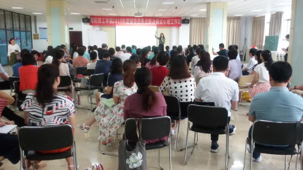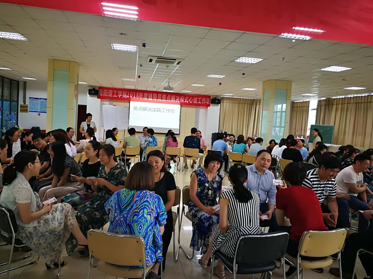 为了进一步提高我校心理健康教育队伍的工作水平,提升工作质量,6月7日至8日,我校举办《焦点解决技术在学生工作中的应用》心理工作坊。全体辅导员、心理健康教育中心教师以及来自南阳师院、河南工院、南阳医专等多所高校的心理教师共百余人参加了为期两天的培训。
