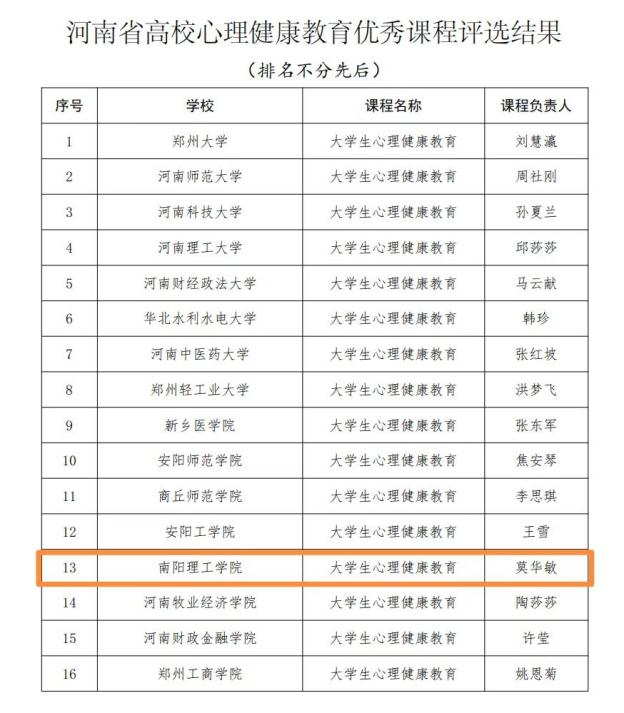 本网讯(特约记者/莫华敏)近日,河南省委教育工委、河南省教育厅公布了河南省高校心理健康教育优秀课程评选结果,我校心理健康教育中心莫华敏申报的《大学生心理健康教育》课程获评“河南省高校心理健康教育优秀课程”。
